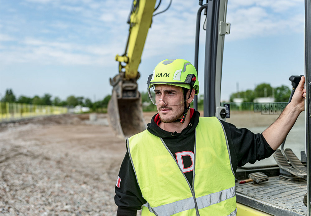 Rund um richtig geschützt auf der Baustelle mit Arbeitsschutzhelm, Auffanggurt und vielem mehr.