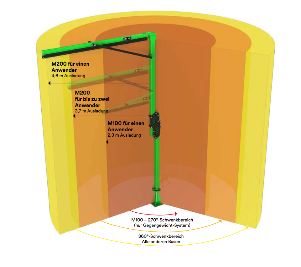 - größere Ausladung von 4,6 m (zwei Anwender bis 3,7 m)
