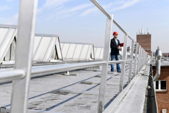 Montieren Sie dieses hochwertige Schutzgeländer aus Aluminium und Edelstahl völlig durchdringungsfrei auf Bitumen und gewebeverstärkter Folie. Das Geländer hat eine Höhe von 1100 mm (Handlauf) und ist für Flachdächer mit einer Dachneigung bis 10° geeignet. Unser Seitenschutzgeländer kann entsprechend den Kriterien der DIN EN 62305-3 als natürlicher Bestandteil der Ableitung einer Blitzschutzanlage eingesetzt werden (100 kA).