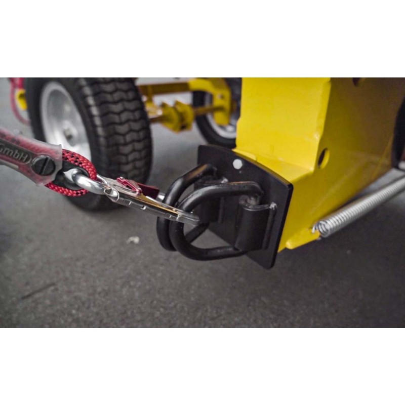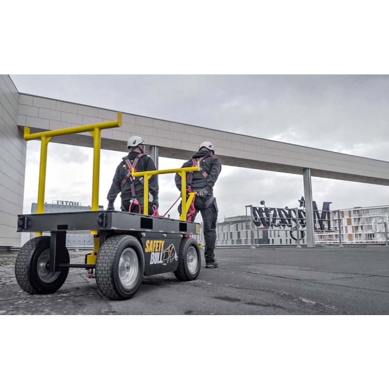 Der SafetyBull kann auf ebenen Flächen einfach von zwei Arbeitern an den Platz gefahren werden, wo er eingesetzt werden soll. Damit stellt er ohne einen goßen Montageaufwand bis zu zwei Personen einen Anschlagpunkt zur Verfügung.