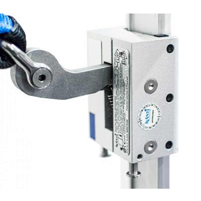 Der Click On Läufer ist aus Aluminium gebaut und klappbar. Außerdem enthält er einen Bandfalldämpfer und ermöglicht das Ein- und Aussteigen an jeder beliebigen Stelle der Leiter. Er verfügt über Synthetic guides (Kunststoffführungen), die auf der Schiene gleiten.