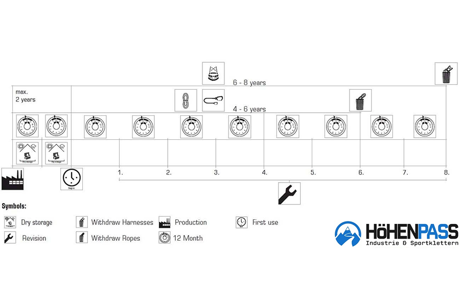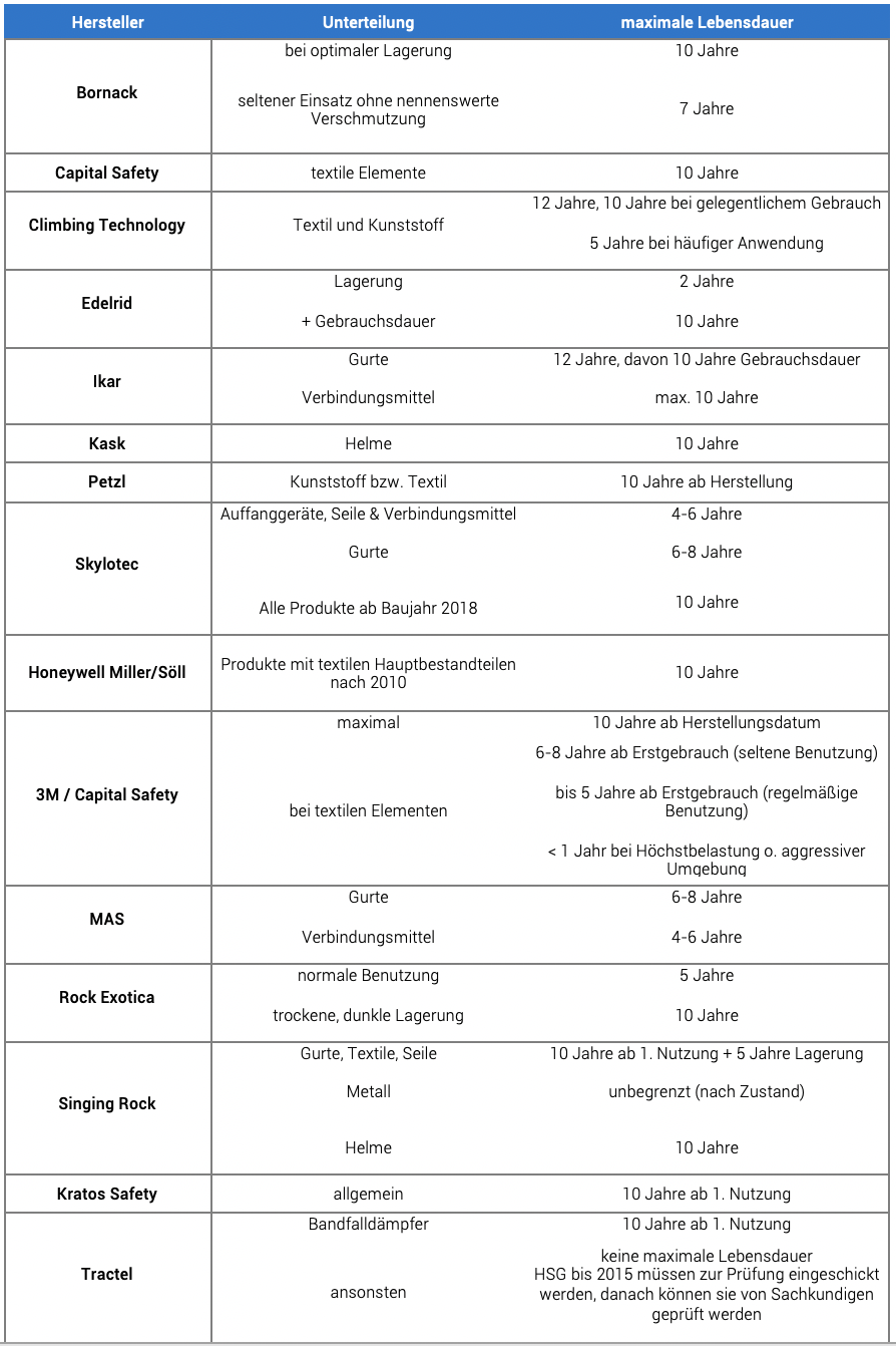 In Punkt. 6.8 ist geregelt: " Aus Chemiefasern hergestellte Gurte und Verbindungsmittel unterliegen auch ohne Beanspruchung einer gewissen Alterung. Diese Alterung der Materialien kommt insbesondere von der Stärke der ultravioletten Strahlung sowie von klimatischen und anderen Umwelteinflüssen.“ Weiterhin: „Nach den bisherigen Erfahrungen kann unter normalen Einsatzbedingungen bei Gurten von einer Benutzungsdauer von 6 bis 8 Jahren und bei Verbindungsmitteln (Seil/Bänder) von einer Benutzungsdauer von 4 bis 6 Jahren ausgegangen werden."
