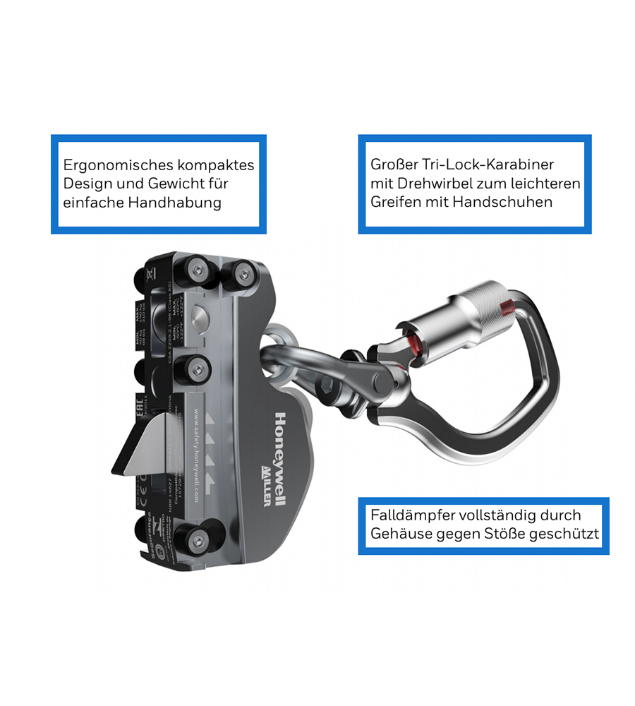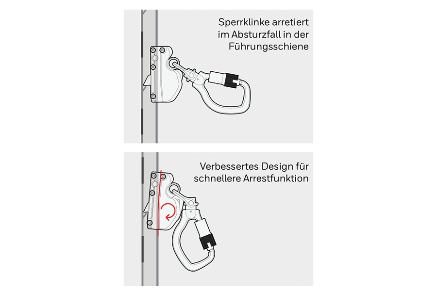 Merkmale der neuen Generation, die höchste Sicherheit garantieren, sind eine vollständig in die Langlöcher der Führungsschiene eingreifende Sperrklinke, durch die eine schnelle Arretierung gelingt. Außerdem gibt es einen visuellen Sturzindikator, welcher anzeigt, ob der Falldämpfer sturzbelastet wurde. Ein Sicherungsstift verhindert das Einsetzen des Auffanggeräts in die falsche Richtung und das Auffanggerät ist zur Verwendung in dem mit "A" gekennzeichneten Brustbefestigungspunkt des Gurtes.