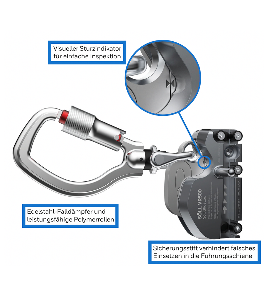 Söll hat in der Entwicklung den Fokus auch auf die Robustheit und Langlebigkeit gesetzt, die mittels Falldämpfer und Innenteilen aus Edelstahl, sowie leistungsfähiger Polymerrollen umgesetzt wurde. Das Gehäuse des VR500 deckt den Falldämpfer vollständig ab, um ihn vor versehentlichen Stößen zu schützen – zur Verlängerung der Lebensdauer des Auffanggeräts und Reduzierung des Wartungsbedarfs.