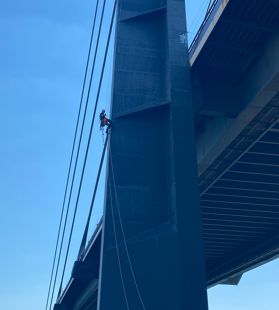 Bei aktuellen Temperaturen von bis zu minus 15 Grad denken wir gerne zurück an den Sommer und die Wärme. Bei den Arbeiten auf der Brücke war dies jedoch eher hinderlich und kräfteraubend. Bei teilweise gemessenen Temperaturen von knapp 35 Grad Celsius war der Einsatz unserer Industriekletterer nicht nur körperlich eine Herausforderung. Die Außenprüfung bei laufendem Verkehrsbetrieb verzeiht keine Unachtsamkeit und so hieß es durchgehend höchst konzentriert zu arbeiten. Gar nicht so leicht bei der Hitze.
