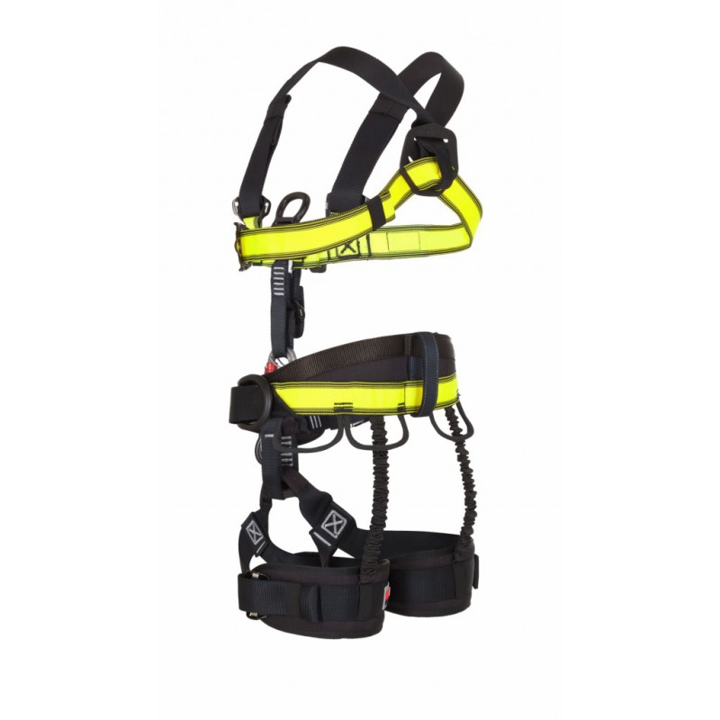 Ergonomisch und funktional bewährte Brust-/Sitzgurtkombination mit horizontal umlaufendem Brustgurt. Die stufenlos einstellbarer Verbindung von Sitz- und Brustgurt bietet eine optimale Anpassung und ermöglicht auch unter erschwerten Bedingungen mit Rückenlast, wie z.B. bei einem freien Hängen mit Atemschutz, ein komfortables Hängen mit voller Oberkörperunterstützung. Durch diverse Halte- und Anschlagösen bietet dieses Gurtsystem ein maximales Anwendungsspektrum vom Rigging bis zur Höhenrettung. Optimal zur Nutzung des Radeberger Hakens.