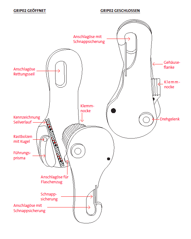 - Integration in seilunterstützte Arbeitsverfahren zum Auf- oder Abseilen. Nutzlast 1 Person.