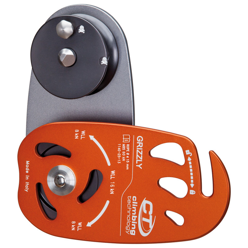 Stark belastbare Seilrolle zum Baumfällen bis zu 80 kN, mit Aluminium-Laufrollen, die auf selbstschmierenden Buchsen mit Stahlstiften und beweglichem Aluminiumseitenteil montiert sind.