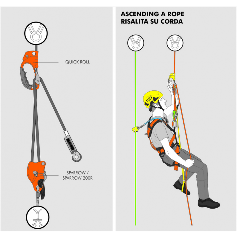 Das Gerät ist wirkungsvoller und platzsparender als der herkömmliche Griff, welcher mit zusätzlichen Karabinern verwendet wird: das Arbeitsseil, das aus dem Abseilgerät kommt, läuft über die integrierte Riemenscheibe, reduziert Reibungen und erleichtert den Aufstieg.