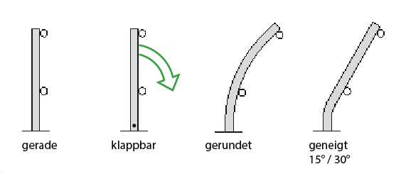 - Stützen in gerader, klappbarer, geneigter und gerundeter Form