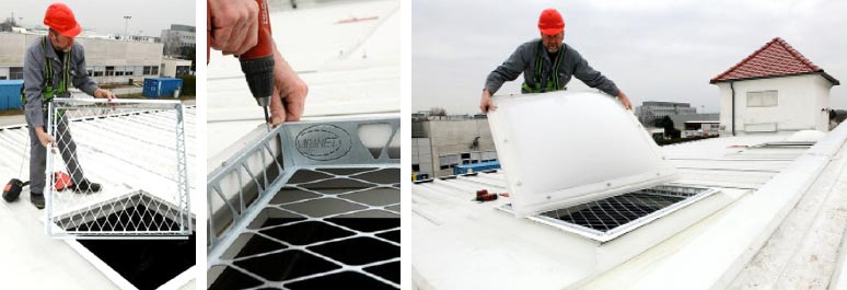 - Wird zwischen dem bestehenden Aufsatzkranz und der geöffneten, vorhandenen Lichtkuppel montiert und schützt damit in Zukunft Personen die sich auf dem Dach befinden vor Durchsturz.