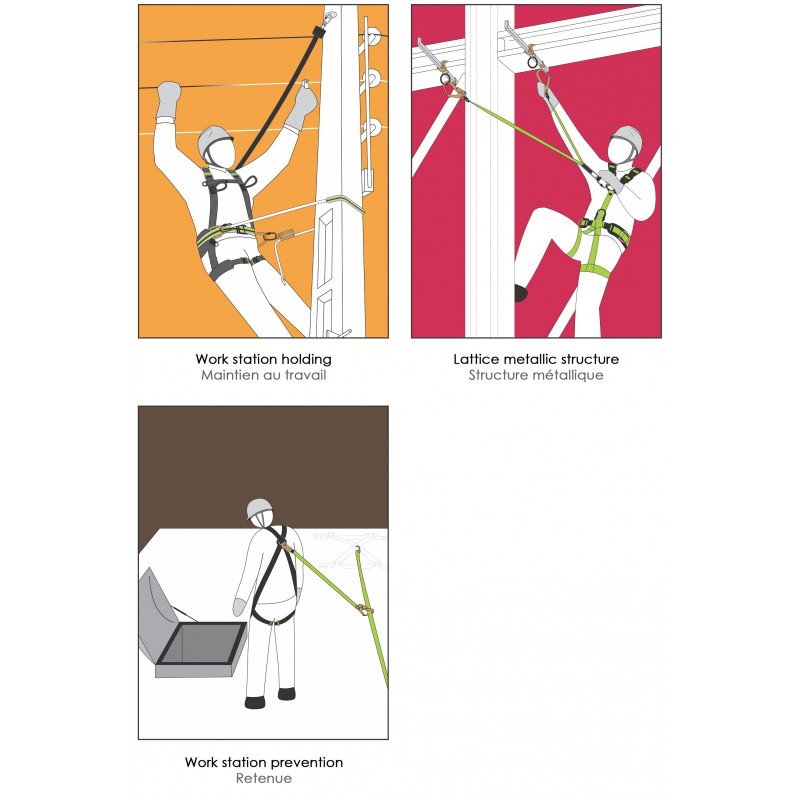 Der Träger kann sich am Rücken, sowie mit den Brust Ösen sichern. Anpassbaer ist der Auffanggurt an den Oberschenkeln.