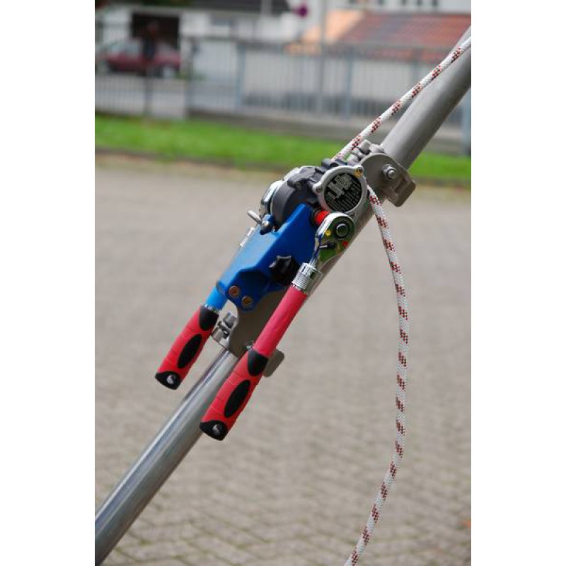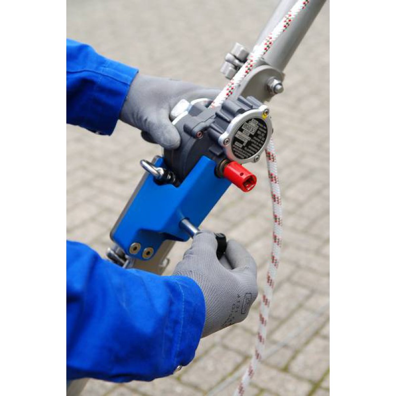 • Am Dreibaum kann der Anwender bequem und sicher durch die Öffnung gelangen. Der weitere Abstieg erfolgt gesichert durch ein mitlaufendes Auffanggerät. Im Gefahrenfall kann sehr schnell evakuiert werden. Das rettungshubgerät bietet die Möglichkeit, beide Arme des Retters einzusetzen. Dadurch ist ein sehr schneller Hub (ca. 5m/min) möglich.