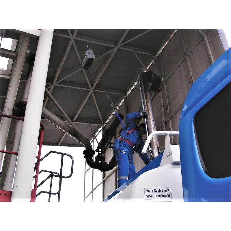 Hierzu wird der jeweilige Arbeitsplatz horizontal mit Stahlseilen oder Stahlträger überspannt. Darauf kann nun das Sicherungsgerät mit dem richtigen Fahrwerk gleiten und ermöglicht freies Arbeiten entlang der Schiene. Im Falle eines Sturzes wird der Anwender sofort mit 0,5 m/s abgelassen und kann danach sofort wieder die Arbeit aufnehmen, oder sich vom Unfallort entfernen. Das 5 mm Sicherungsseil ist aus rostfreiem Stahl gefertigt und ist mit einem Schnellschließkarabiner versehen. Im Gerät wird es auf der Seiltrommel in den vorgesehenen Führungsrillen aufgerollt. Durch die präzise Auffwicklung auf der Trommel wird ein eventuellen Nachrutschen verhindert. Das Sicherungsgerät kann auf Wunsch auch mit einem Zusatzmodul aus- gerüstet werden und erfüllt somit die ATEX-Richtlinie für explosionsgefährdete Bereiche.