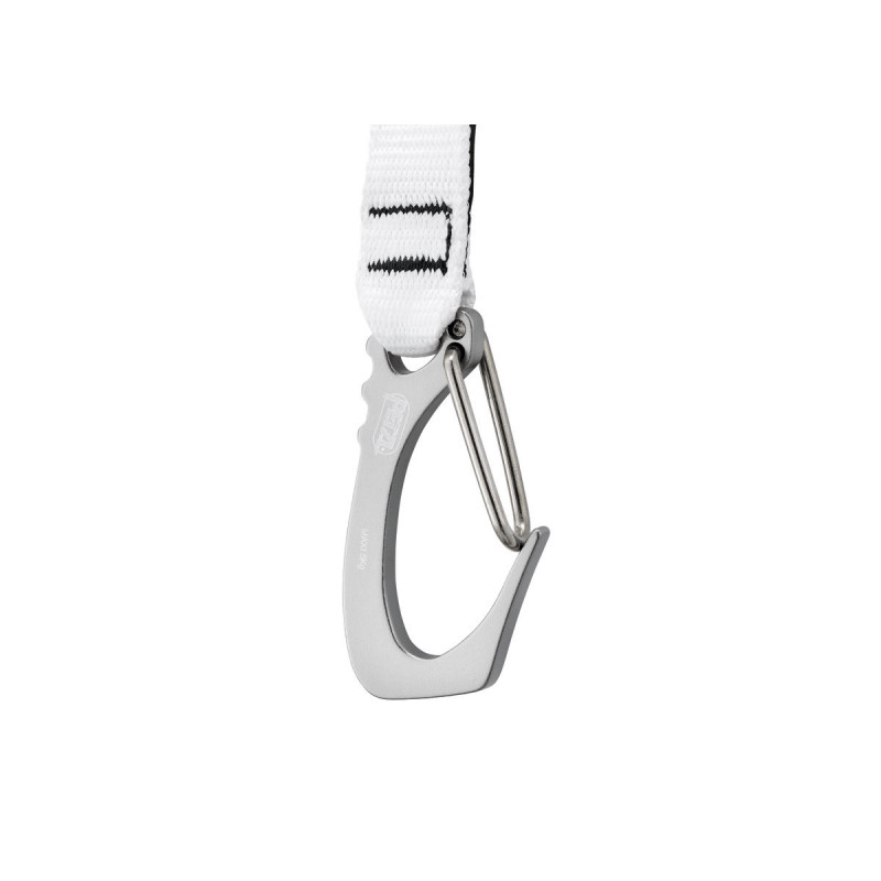 - Der untere Riemen ist mit einem Karabiner für die Verbindung mit der Gurtbandschlaufe an der Oberseite des Baumpflegerschuhs versehen.
